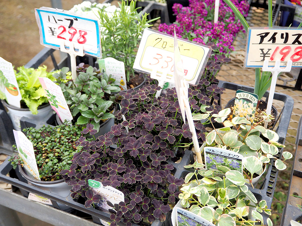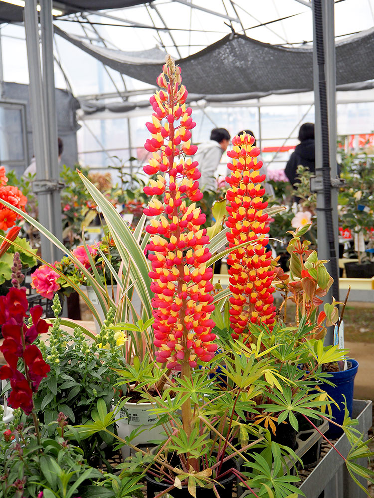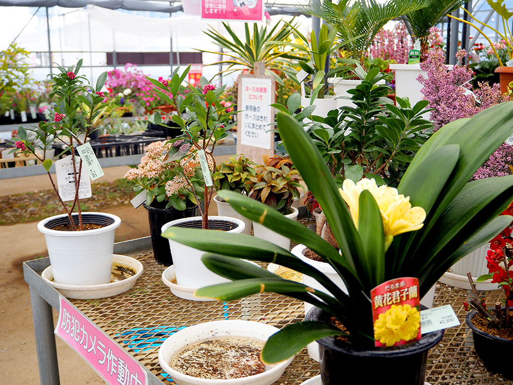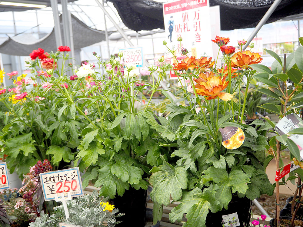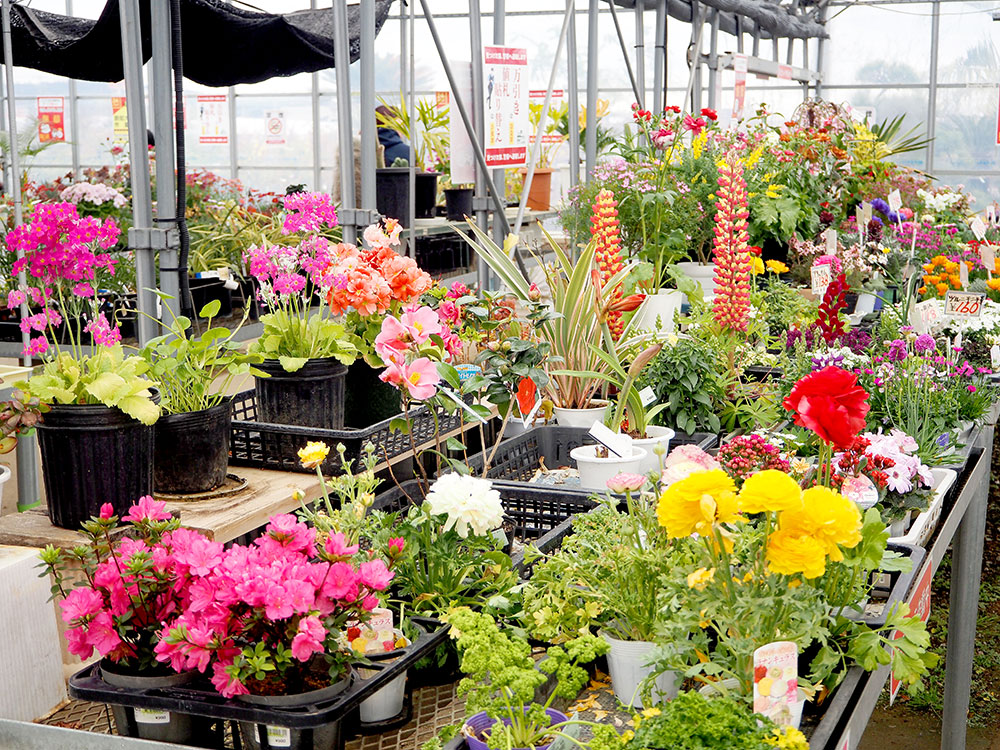 緑花木市場のパイプハウスでは、春の花々が色とりどりに楽しげに並んでいます。
