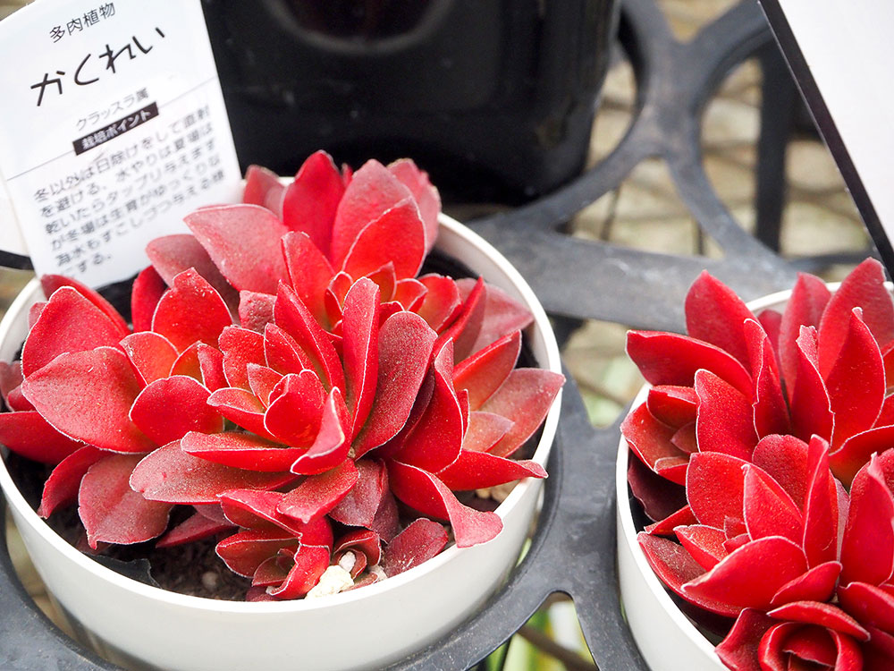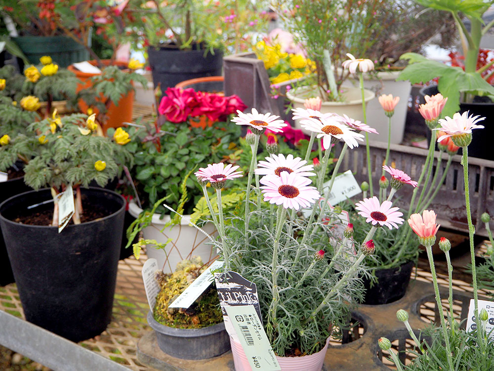 向かって左側のパイプハウスは、かわいらしい多肉植物や風流系の花などがズラリ。