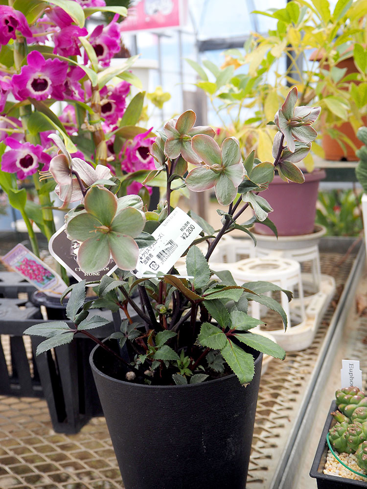 緑花木市場レジ横では、今が開花シーズンのクリスマスローズが可憐な花を咲かせています。