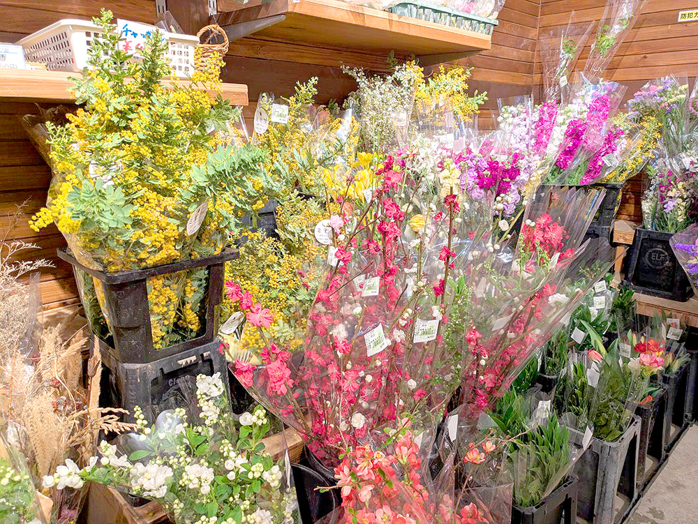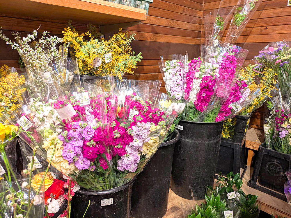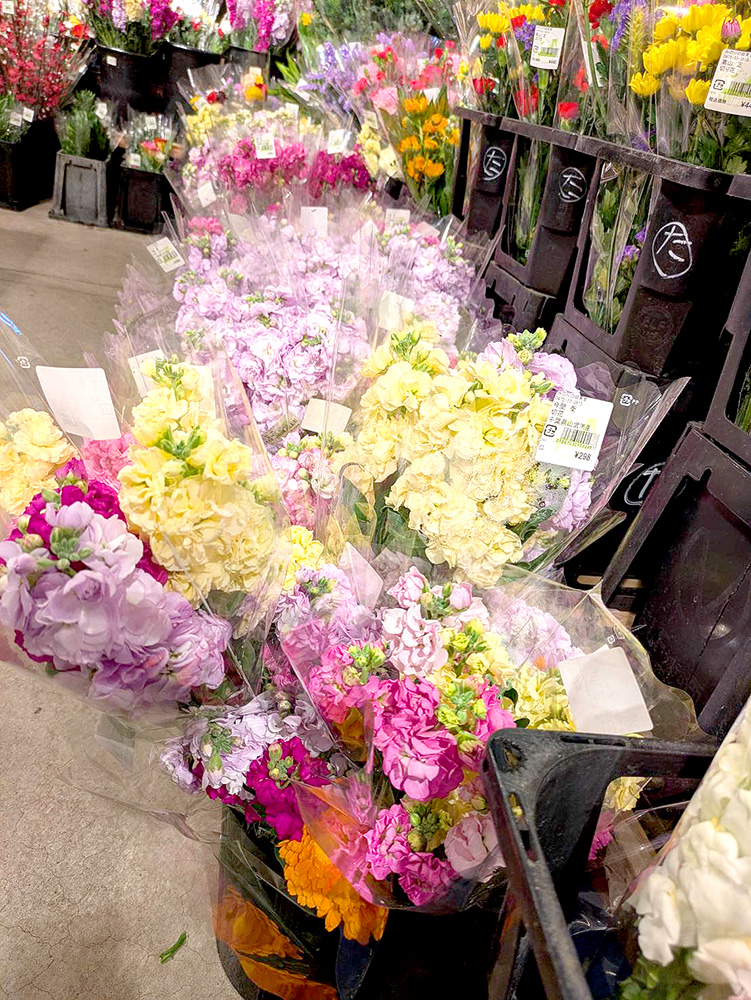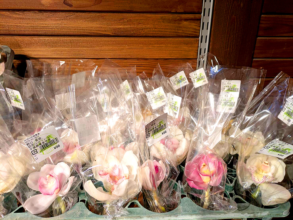 切花コーナーは、ストックの香りが充満しているほどたくさん入荷しています。また、東金産シンビジュームも旬真っ盛り!