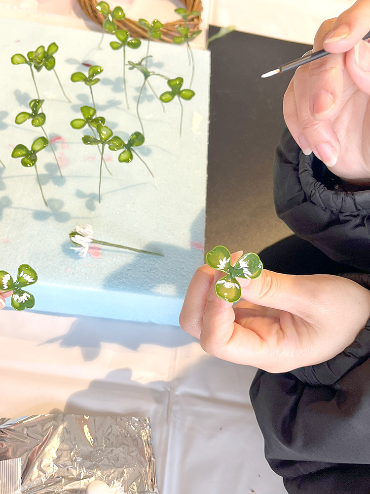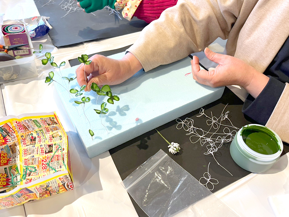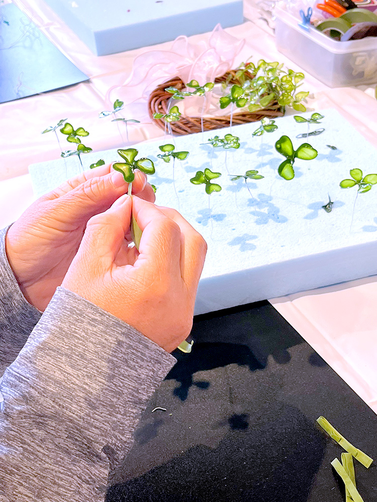本日は「アメリカンフラワーでつくるクローバーリース」体験教室を開催しています。