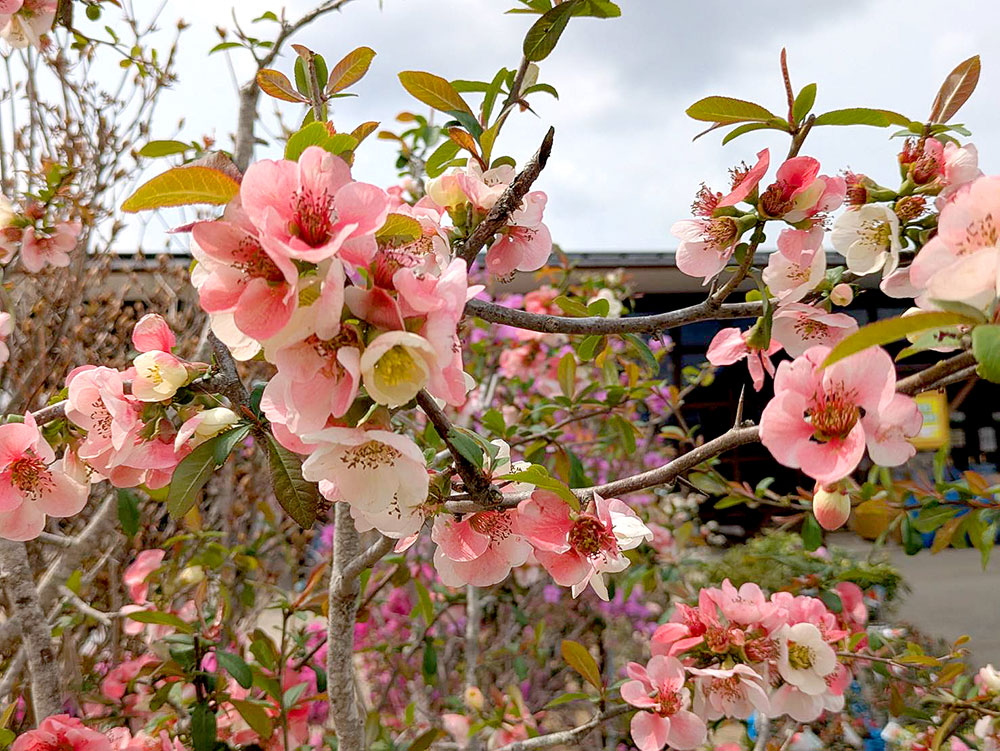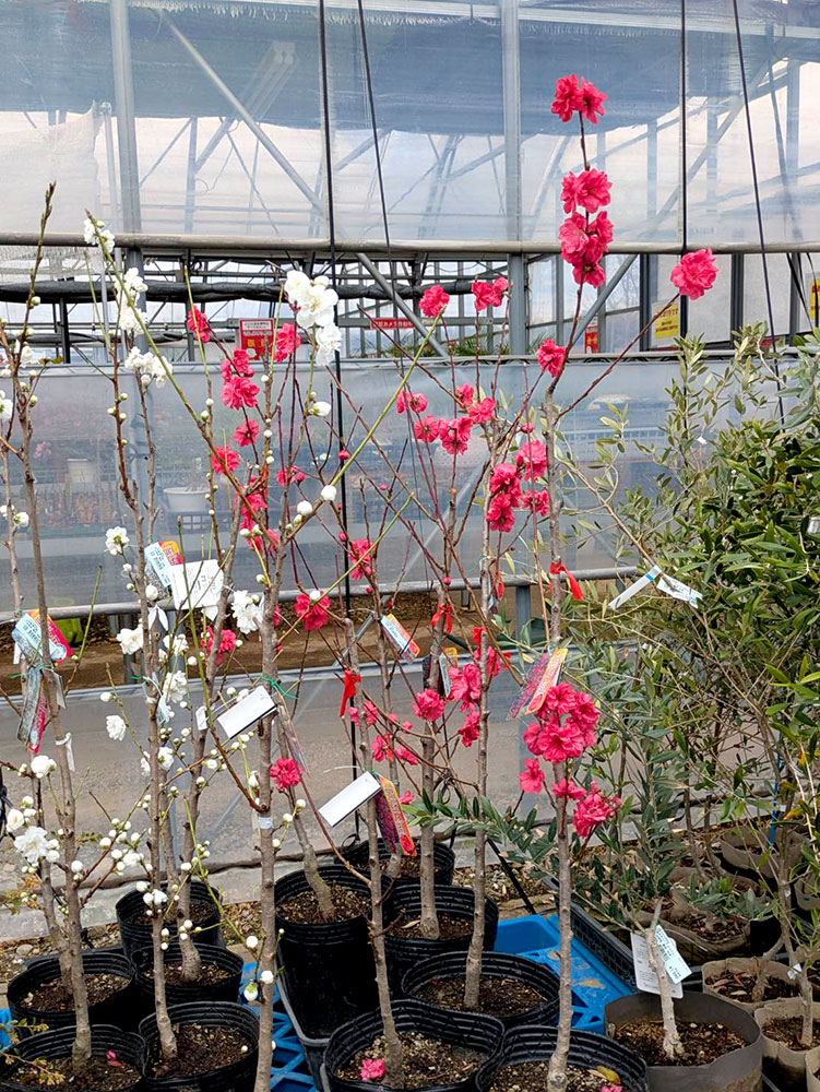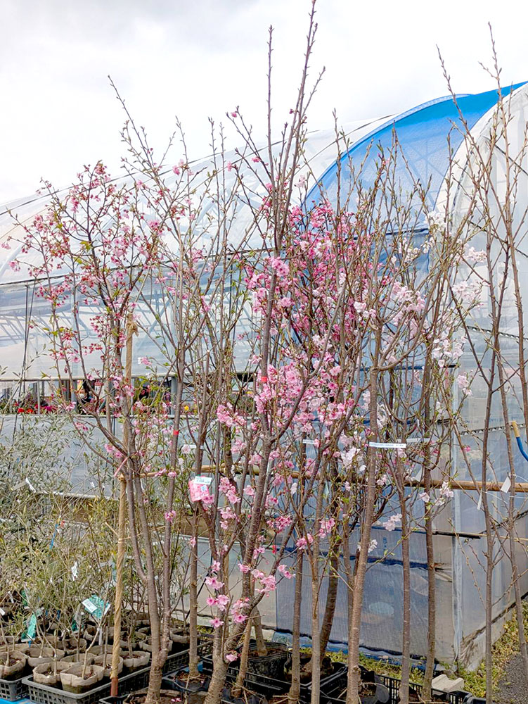木瓜や花桃のコンディションの良い大苗がたくさん並んでいます。かわいらしい満開の小花にうっとりしますね。