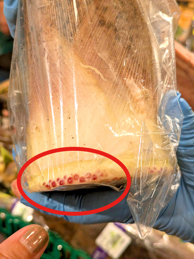 おススメのタケノコは、赤丸がついているように赤いプツプツとなっているところが見ているもの、プツプツは小さくて少ないほうがよいらしいです。