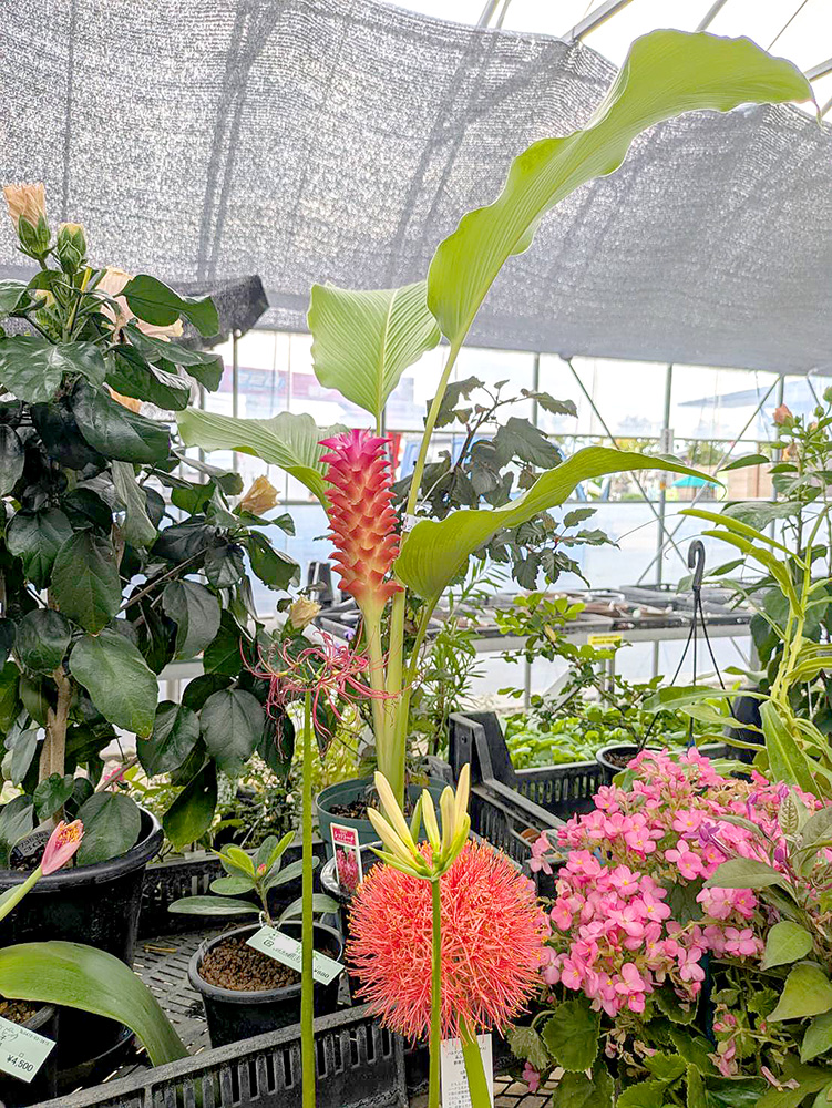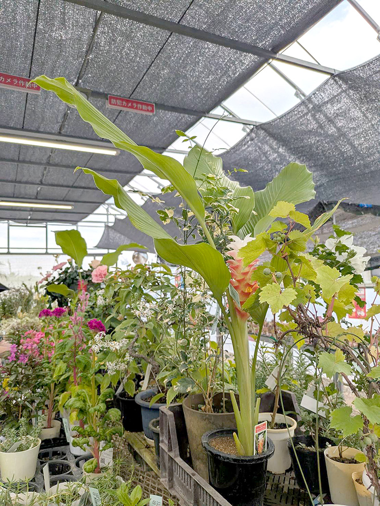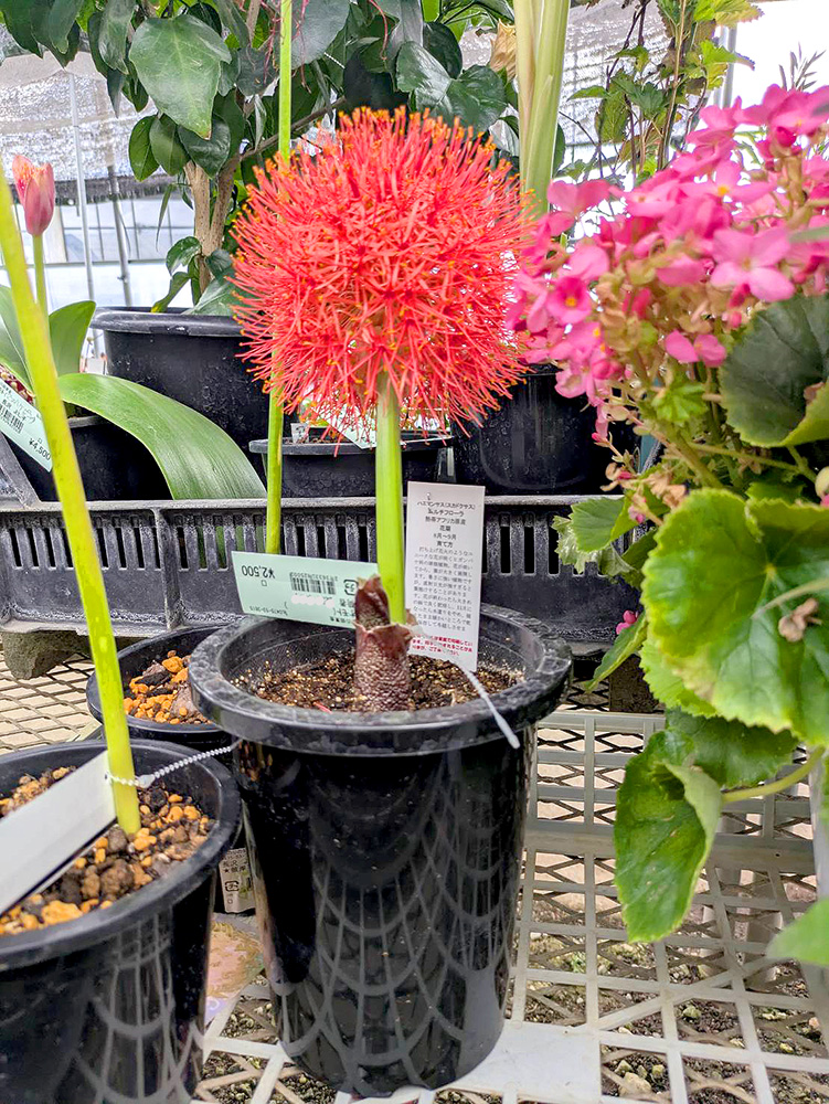 赤と白の2種類の鉢が並んだのはクルクマ。多年草ですが寒さに弱いそうですので、これからの季節は暖かくした室内で。半透明の存在感のある苞(ほう)が美しいです。